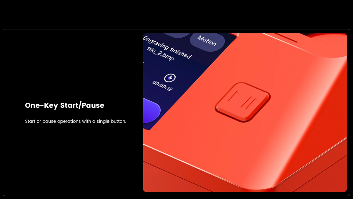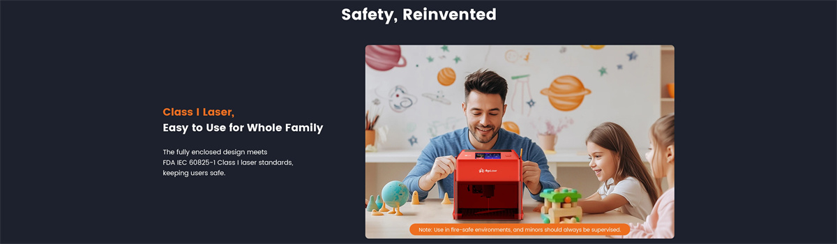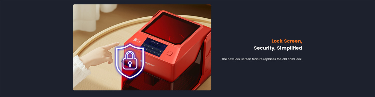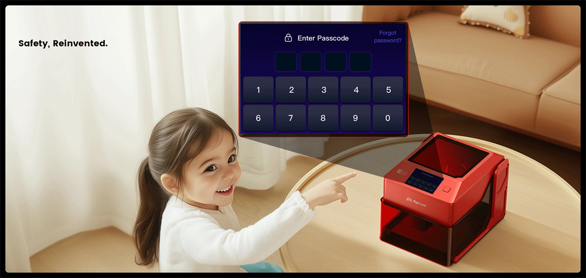 Le design entièrement fermé répond aux normes laser de classe I de la FDA IEC 60825-1, Garder les utilisateurs en sécurité. La nouvelle fonctionnalité de verrouillage de l’écran offre une protection par mot de passe sans effort et une sécurité améliorée,vous offrant une tranquillité d’esprit,où que vous soyez. Arrêt automatique avec couvercle de protection : l’ouverture du couvercle de sécurité laser interrompt automatiquement le fonctionnement. Une fois fermé,la machine reprend là où elle s’était arrêtée.