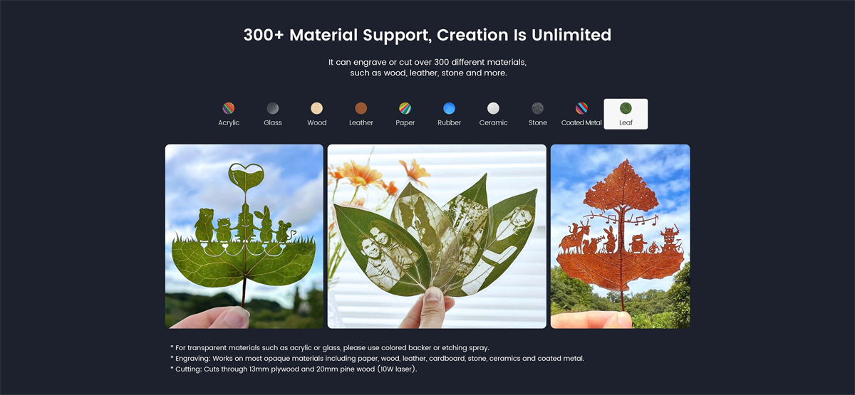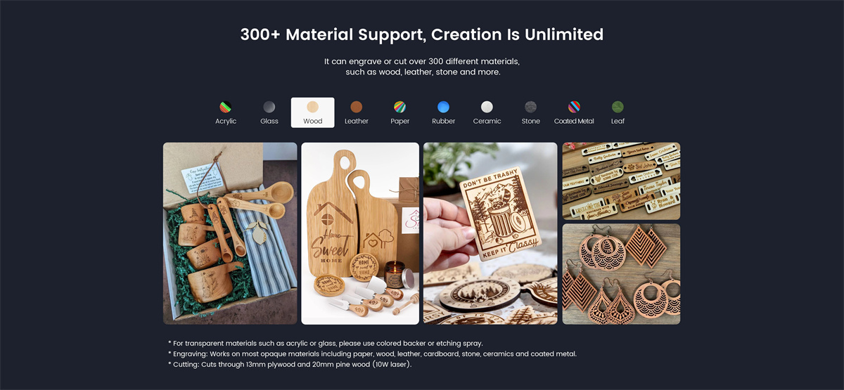1. La machine de gravure laser PIXIlaser est équipée d’un laser bleu à diode de 10W et convient à la gravure de divers matériaux,y compris le bois,le bambou,le papier,le cuir,le carton,le liège,la pierre et plus encore. Que vous travailliez sur de petites œuvres d’art ou des projets plus grands,le PIXI gère sans effort divers matériaux et élargit vos possibilités créatives.