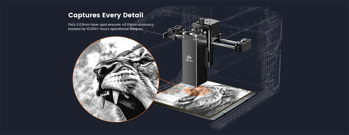 The Pixifeatures a axe Z tourné à la main pour la mise au pointavec un bouton de réglage en haut et un couvercle de protection. Cela permet aux utilisateurs de régler facilement la hauteur du laser.