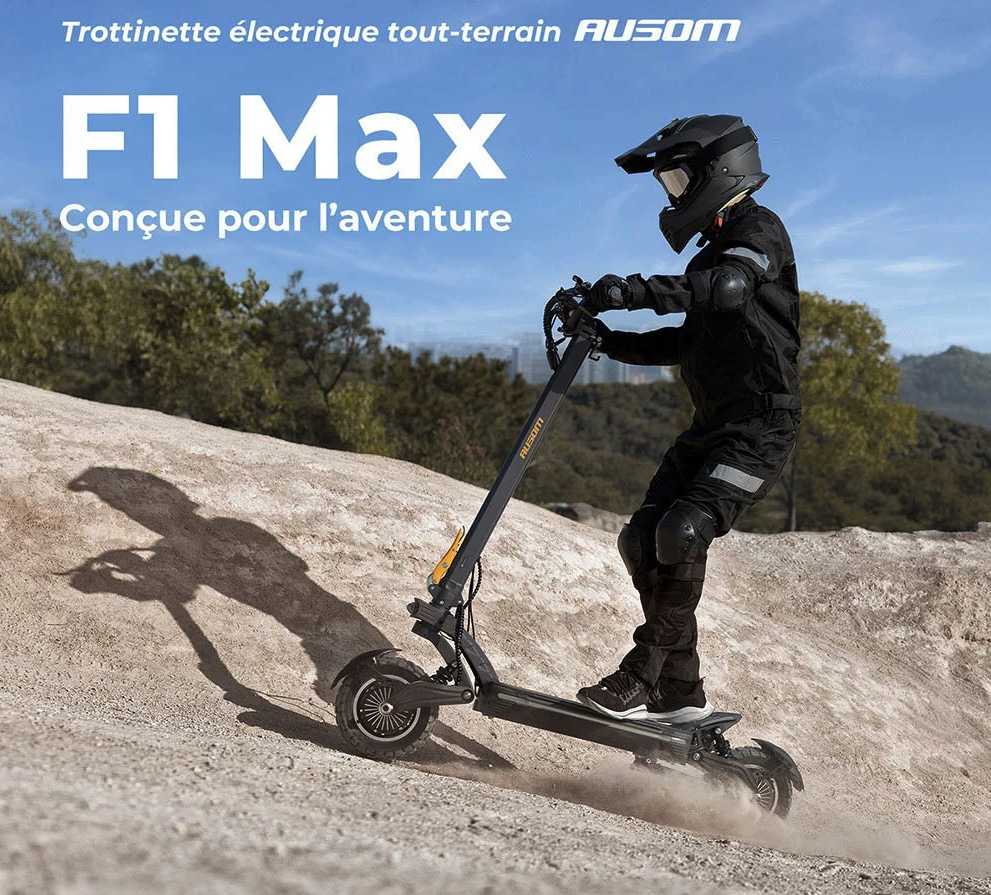 Trottinette électrique Ausom F1 Max, moteur 2 x 1 400 W, batterie 60 V 20,8 Ah, pneus 10 pouces, vitesse maximale 72 km/h, autonomie maximale 100 km, freins à disque hydrauliques avant et arrière, verrouillage NFC et par code